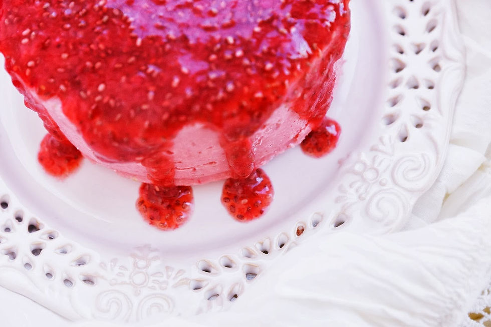 W malakserze zmiksuj wszystkie składniki, po za olejem kokosowym. Najlepiej jeśli zaczniesz od orzechów makademia. Aby ułatwić sobie pracę, możesz je zmielić na mąkę w mlynku do kawy. Po otrzymaniu gęstej masy, zwolnij obroty malaksera i dodaj olej kokosowy. Miksuj jeszcze kilka sekund. Następnie wylej masę do foremki o średnicy 10 cm i wstaw na 5-6 godzin do zamrażarki. Wierzch mojego sernika polałam zmiksowanymi truskawkami z nasionami chia.